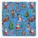 Christmas-themed pattern featuring Santa Claus, reindeer, snowmen, elves, Christmas trees, candy canes, and snowflakes on a blue background