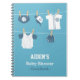 Compile a guestbook for the event with this baseball themed baby shower guestbook! This modern, classy yet cute baseball design has baby items hanging on clothesline for the little one. They include a baseball diaper, a hat with star icon, baseball tees and a mitten. A colour palette of blue and white which makes it most suited for a baby boy. Personalise easily with message.