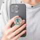 On this phone PopSocket, a blue silhouette baseball batter is placed on a retro style circle rainbow background of distressed stripes. Your name or other text is in matching blue in curved text at the top.