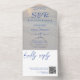 Blue & white all in one wedding invitation beach background photo. Personalize it with your event details and your wedding registry QR code.