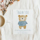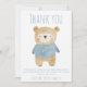 Express your gratitude with this adorable baby shower thank you card featuring a sweet bear illustration wearing a soft blue sweater. The minimal, pastel design is perfect for baby boys and features a heartfelt message with family name text. Ideal for sending appreciation to your guests for their thoughtful gifts and kind wishes.