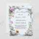 A soft light blue background, decorated witth pink and blue wildflowers and a blue ribbon. Personalize and add a name and party details.