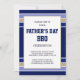 This bold, masculine design features blue and beige stripes on a navy blue background. The customizable text for the type of Father's Day event (BBQ, cookout, brunch, dinner, party, etc.) and location, RSVP and contact details appear inside a gold edged white area in the center in popular, masculine navy blue and black typography on the front of the card. The back of the card features the same bold blue and beige stripes.