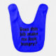 A cute, funny bib for babies and toddlers with a blue background and black text that reads Does This Bib Make Me Look Hungry?