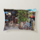 Casual, relaxed, riding around on bicycles, these are some of the things that make up the comfortable lifestyle pictured in the original photograph by ZoeSPEAK on this Accent Pillow. An aqua blue bicycle leans against a post in front of an open air bar in Key West, Florida. There is a leafy green bush in a tub, under an awning which matches the color of the bike. The dark interior of the place is filled with wooden bar stools, and aqua and cobalt blue umbrellas over the tables. An aqua blue bar in front completes the colorful photo.