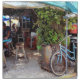 On this Cloth Dinner Napkin - Casual, relaxed, riding around on bicycles, these are some of the things that make up the comfortable lifestyle pictured in this original photograph by ZoeSPEAK, of an aqua blue bicycle leaning against a post in front of an open air bar in Key West, Florida. There is a leafy green bush in a tub, under an awning which matches the color of the bike. The dark interior of the place is filled with wooden bar stools, and aqua and cobalt blue umbrellas over the tables. An aqua blue bar in front completes the colorful photo.