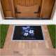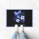 European inspired door mat done in black with a light blue border and with graphics of blue bird and blue and white Edelweiss flowers. Personalize the custom text to suit your needs.