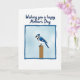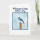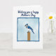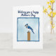 This card features a blue songbird with rich navy and sky-blue feathers, softened by small gray and white markings, perched calmly on a sturdy vertical wooden post near the lower center. The bird’s slightly tilted head and relaxed stance suggest a gentle, affectionate pause, like a quiet moment shared between close friends ❤️. Behind it, a sky-like background shifts from deeper blue at the top to a pale, airy wash toward the bottom, creating a calm open space. A wavy deep-blue border line frames the scene, adding a soft decorative edge without crowding the artwork. Near the top, a short greeting appears in flowing cursive-style lettering, set in deep blue and centered above the bird. The open spacing around the words keeps the focus on the bird below, as if the message is floating in the sky. A small touch of warmth comes through in the smooth color transitions and the bird’s tender, watchful gaze 🌼. The dark blue border line gently ripples around the pale blue background.