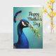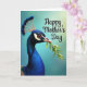 This design shows a close-up portrait of a regal blue bird filling the left side of the card, its sleek profile turned slightly toward the viewer. Deep, shimmering feathers in layered blues look soft and velvety, while a fan-shaped crest rises from a warm beige base like a delicate crown. The bird gently holds a small sprig of fresh green leaves in its beak, like a quiet offering ❤️. Its amber eye glows with an intent, knowing look, framed by pale yellow and darker markings that add contrast and character. Behind it, the background fades smoothly from cool teal along the lower left into a pale yellow-green wash toward the upper right, giving the scene a calm, sunlit feel. In the upper right, a short message appears in flowing lettering, set in a darker teal tone that stands out against the lighter corner. The sprig shows several bright green leaves with thin stems, angled upward toward the text 🌼.