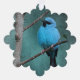 A vibrant blue bird is perched on a branch against a textured background with vintage handwriting and postmarks. Its feathers offer a stark contrast to the muted green and grey tones of the backdrop, and the image has a dreamlike, nostalgic quality.
