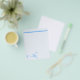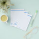 Customized bird stationery that features a blue bird standing on a tree limb in the bottom left corner and a blue stripes across the top. Mix and match our stationery pages to make great gifts for girls who like to write special messages to friends and family.