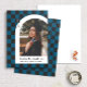 This modern and unique graduation announcement features a navy blue and black checkered background highlighting a photograph of the graduate framed in a white arch with the graduate's name and school beneath. A small gradation cap is cleverly displayed in the checked background with the graduate's graduation year. The back has a fun matching checked pattern in dark turquoise blue and black.