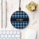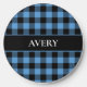 Blue and black gingham check pattern features a black banner across the center with your custom name in a cool white serif font. Add your name, monogram, or text in the sidebar to personalize it.
