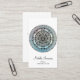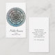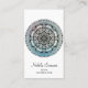 A beautiful mandala symmetrical geometric floral pattern on a blue bokeh shimmer background yoga instructor business card, personalized with your name in a trendy script style font. Personalize for your yoga practice. You may also want to customize it for a meditation practice.