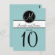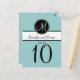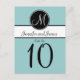 Elegant Simple Blue Black White Monogram Wedding Table Number Cards. Elke Clarke © These wedding Table Number postcards are shown with a light blue background, white monogram initial on a black circle tag and bride and groom names on a black and white stripe. Customize with bride and groom names, monogram initial, table number and wedding colors using Zazzle's easy to use menu prompts. This simple yet elegant monogram initial design works for all letters of the alphabet and is fully customizable to suit any color combination. Order one card for each different table number. You change it to each number and then add to your cart.