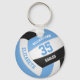 This sporty volleyball themed keychain features a realistic looking light blue, black and white volleyball upon which you can customize the player's name & jersey number plus school or club name and mascot name in a varsity letter style font - by katz_d_zynes