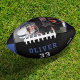 Blue Black Player's Name Number Photo Football. Personalize it with your photo, player's name, number and year. The text is trendy white and blue typography on a black background with a blue stripe. You can change any text on the football or erase it. A perfect gift for a football player, teammate or coach.