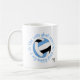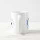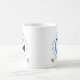 This cute girls' volleyball coffee mug with monogram features the typographic phrase, "The volleyball court is my happy place" and two heart outlines in light blue encircling a volleyball with light blue, black and white colored panels - customize with monogram - by katz_d_zynes