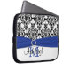 This personalized white, black and blue damask laptop sleeve with a FAUX ribbon and jewel brooch has text boxes for you to customize with your own name, monograms, business name, or other text. If you need any help customizing, please email niteowlstudio@gmail.com.