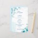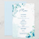 This wedding menu card exudes a soft, calming elegance with its cool blue floral design. The watercolor-style flowers flow gracefully along the upper left and lower right corners, giving the card a delicate, airy feel. The background is a subtle wash of pale blue tones, reminiscent of a watercolor sky, which enhances the card’s gentle aesthetic. The script font used for the names is both elegant and modern, while the additional text is presented in a clean serif font, ensuring readability while maintaining sophistication. Ideal for a spring or beach wedding, this invitation creates a serene and inviting first impression for your special day.