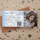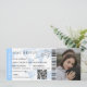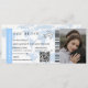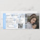 Modern minimalist dusty blue monogram boarding pass wedding ticket with a simple white and brown background, a photo of the engaged couple, a plane with a loop trail, and an easily customizable save the date template. Don't forget to change the text on the back of the monogram.