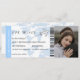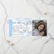 Modern minimalist blue monogram boarding pass wedding ticket with a simple white and brown background, a photo of the engaged couple, a plane with a loop trail, and a personalized save the date template that is easy to personalize. Don't forget to update the monogram text on the back.
