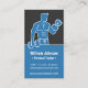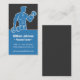A business card in blue, black and white for freelance personal trainers, fitness instructors, body builders and anyone in the heath and fitness industry. It has a blue silhouette and white outlines of a muscular, lean fit topless male training his biceps with a pair of dumbbells. Personalize with your business details easily in the space provided.
