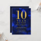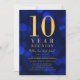 Classy class reunion invitation featuring the words "10 Year Reunion" in faux gold foil against a blue bokeh lights pattern background. Invitation has a blue background back side.
