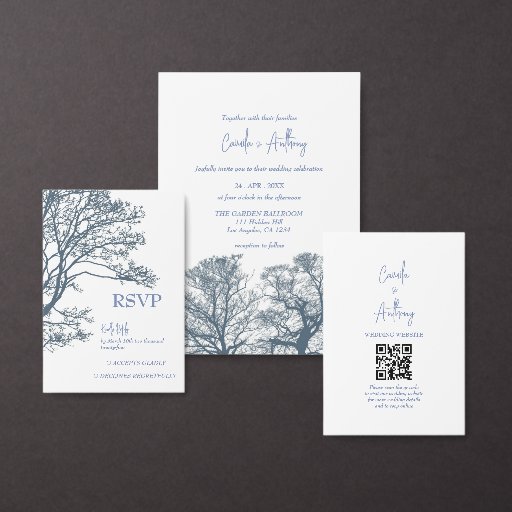 Plain white envelopes are included with paper invitations and will come to fit the invitation size you select. If you don’t need the envelopes, you may choose to not receive them by selecting the dropdown below "Envelopes" and choosing "None." If you’d like to have a design on your envelopes, you can browse all of these available envelopes to find the design that complements your Blue Bottom Trees Tropical Boho Wedding Invitation.