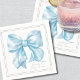 A charming cocktail napkin design featuring a large watercolor blue bow in the center. The mom to be's name is displayed in a classic serif font, with "Baby Shower" elegantly written below in handwritten script calligraphy. Around the edges of the napkin is a subtle double line frame in soft gray, adding a touch of sophistication and balance to the design.