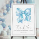 Blue Bow Baby Shower or Bridal Shower Thank You Sign. This elegant sign features a soft blue watercolor bow at the top, paired with gray fonts in a mix of script and serif typography. The design includes a simple double-line frame, with the option to customize the border by changing the bottom rectangle color.