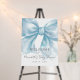 Double-Sided Blue Bow Baby Shower Welcome and Thank You Sign. This elegant two-sided sign features an oversized blue watercolor bow stretching across the top of both sides, offering a bold and stylish statement. Gray fonts in a mix of script and serif typography add a refined touch.