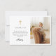 Baptism thank you card that features a blue bow and a simple gold cross.
