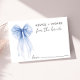 Elegant bridal shower enclosure card for friends and family to express their advice and hopes for the bride's future married life featuring a blue coquette bow watercolor and "Advice + Wishes for the bride" in a blend of a chic script and modern lettering. On the back, personalize with the bride's name and the shower date.