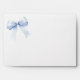 White background. Personalize and add a name and your return address. The name is written with a modern and trendy handlettered style script. Decorated with a blue bow.