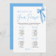 Make your bridal shower unforgettable with the "What's In Your Purse" game, featuring a charming blue bow design. This fun and interactive game invites guests to rummage through their purses and tally points based on the items they find. Each item on the list is assigned a point value, with the guest accumulating the most points winning a prize. The elegant blue bow theme adds a stylish touch to your event, and the game cards are available for instant download, making it easy to print them at home. This game is perfect for breaking the ice and bringing guests together in laughter and friendly competition. If you have any questions or need assistance, feel free to reach out!