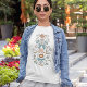 Boho and rustic women's t-shirt featuring hand drawn illustration of bows and flowers in blue.