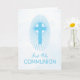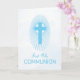 On a First Holy Communion, a circle surrounds the center of the cross representing the host. Rays are coming out of the center giving a joyful feeling on this blue First Holy Communion congratulations card for a boy!