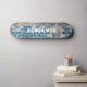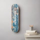 Unique skateboard has a rustic blue brick wall background, with some bricks painted white and rust. You personalize it with your name using the easy to use template. It's funky and colorful and would look great hanging on the wall in your room. Or, order it with the trucks and wheels and get on it and have a wild ride!