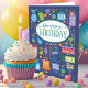 A bright pastel and navy 50th birthday card full of every thing birthday and party related. Cakes, presents, balloon, flowers, and party hats fill the card and also form the bottom border on the inside of the card.