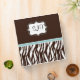Cute chocolate brown, powder blue, white zebra print binder features stylish stripe pattern on front and back with whimsical scroll frame on front. Add your custom text to the front and spine.