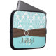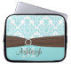 This personalized aqua blue, chocolate brwon, and white damask laptop sleeve with a FAUX ribbon and jewel brooch has text boxes for you to customize with your own name, monograms, business name, or other text. If you need any help customizing, please email niteowlstudio@gmail.com.