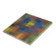 A cool ceramic tile, with an abstract chequered pattern in shades of dark blue, dark green and warm earth colours, from a digital design by Judy Adamson. Add a wooden frame to use as a trivet.