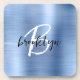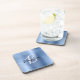 This elegant personalized coaster features a monogram and first name in modern black and white script on a light blue brushed metal background.