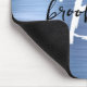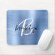 This elegant personalized mouse pad features a monogram and first name in modern black and white script on a light blue brushed metal background.