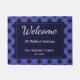 A stylish and eye-catching doormat with a blue buffalo plaid design. The buffalo check pattern forms an attractive surround to the central section, which is dark blue with white text. The wording begins with 'Welcome' at the top in script typography. Below this, the mat can be personalized with your address, name(s), and date 'established' at this residence. An ideal housewarming gift and a charmingly warm welcome for your guests.