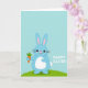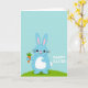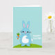 This card shows a chubby little bunny in soft pastel blue, with long curved ears that have pale pink inner details and a faint blush on its cheeks 🐰. Its big black eyes and small smile with two front teeth give it a sweet, friendly look, like it’s ready to share a quiet moment with someone close. One paw holds a slim orange carrot topped with leafy green stems, adding a bright contrast that feels like a small gift between friends 🌷. The bunny stands on a rolling strip of emerald-green grass with gently scalloped edges, suggesting a simple spring meadow. Above that, most of the background is an open field of calm sky-blue, leaving lots of airy space around the character. In the lower right area, a short Easter greeting appears in white, all-caps lettering that sits neatly against the blue. The carrot’s orange body and green top are centered near the bunny’s chest, with the white text tucked just above the grass line on the right.