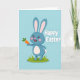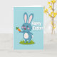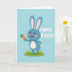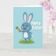 This card shows a cute, human-like bunny standing front and center in a calm mix of sky blue and soft pink 🐰. The bunny has extra-long ears, round shining eyes, and rosy cheeks that make its smile feel like it’s meant for someone special. It stands on an oval patch of green grass, as if it has paused mid-step to greet a friend. One paw reaches outward, offering a bright orange carrot with leafy green tops, like a small, sweet gesture between close pals. The background stays a single, airy blue so the character and the gift stand out clearly. On the right side, a short Easter message appears in rounded white letters, spaced neatly against the blue. A faint shadow sits under the grass, and tiny highlights in the bunny’s eyes add a gentle sparkle 🐇.
