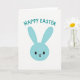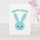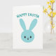 Designed with a bright white background, this Easter card features the head of a stylized long-eared bunny in soft pastel sky-blue 🐰. The rounded shape sits low and centered, like it’s gently peeking up to meet you, adding a sweet, friendly closeness. Two black oval eyes and a tiny inverted “Y” nose-and-mouth give the bunny a tender, calm expression, as if it’s sharing a quiet moment with someone just off the page. Above the bunny, the words “HAPPY EASTER” curve in a teal-green tone, placed high and centered so the greeting feels like it’s hovering warmly overhead 🌷. The letters have slightly uneven, rounded edges that make the text feel casual and welcoming without looking stiff. A faint gradient in the blue adds a soft sense of depth, keeping the bunny’s face from looking flat. The composition stays simple, with plenty of open space between the arched teal-green text and the pastel-blue bunny head.
