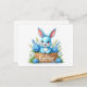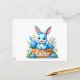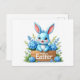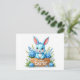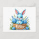 A cute cheerful blue bunny with a basket of flowers friendly expression wishes you Happy Easter.